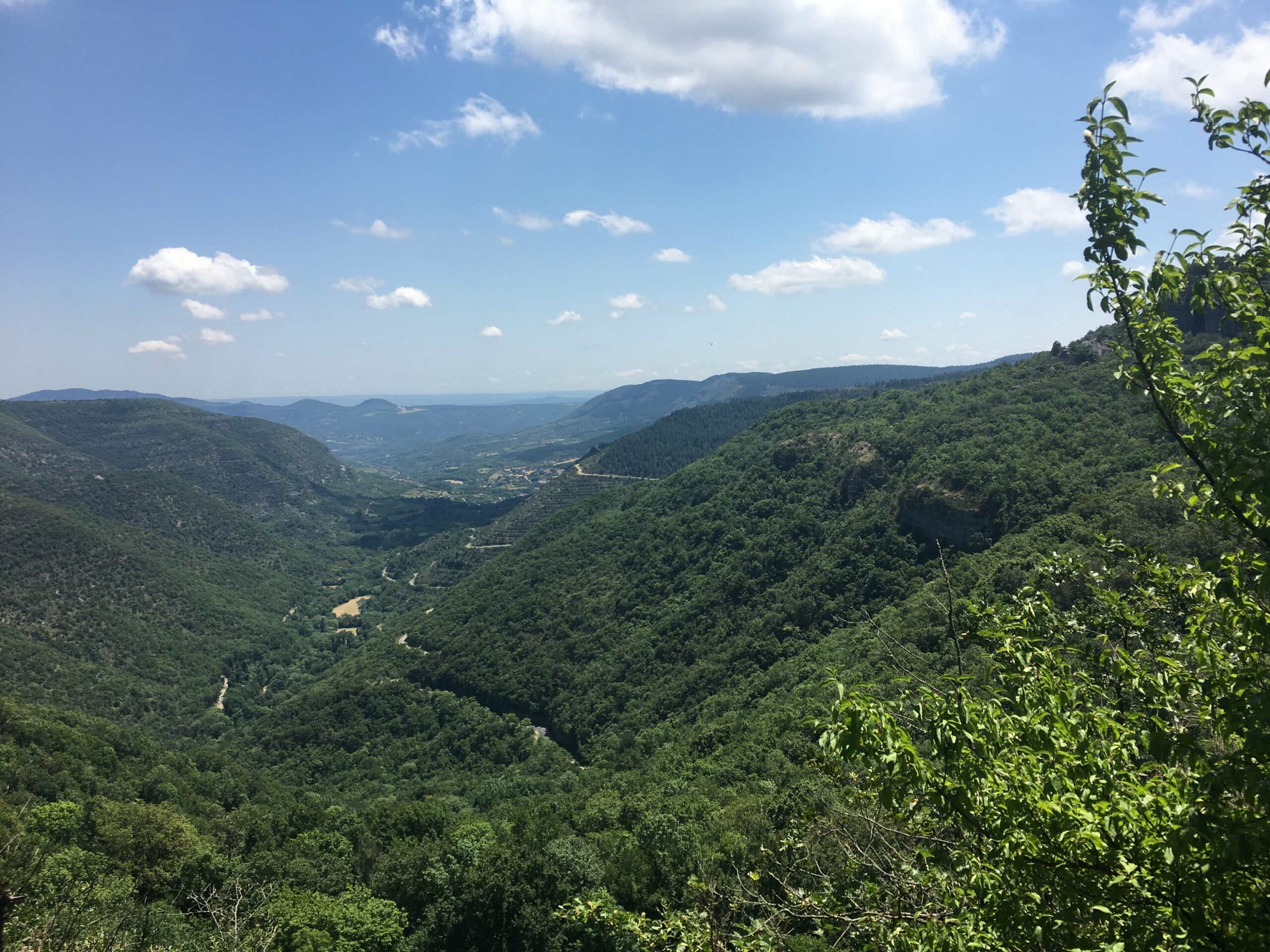 Je longe une vire boisée avec un vide à gauche et une très belle vue sur la vallée, puis j’arrive sur le causse dans une forêt de hêtre. Le sous-bois est très agréable lorsqu’il fait chaud, ce qui est le cas aujourd’hui.